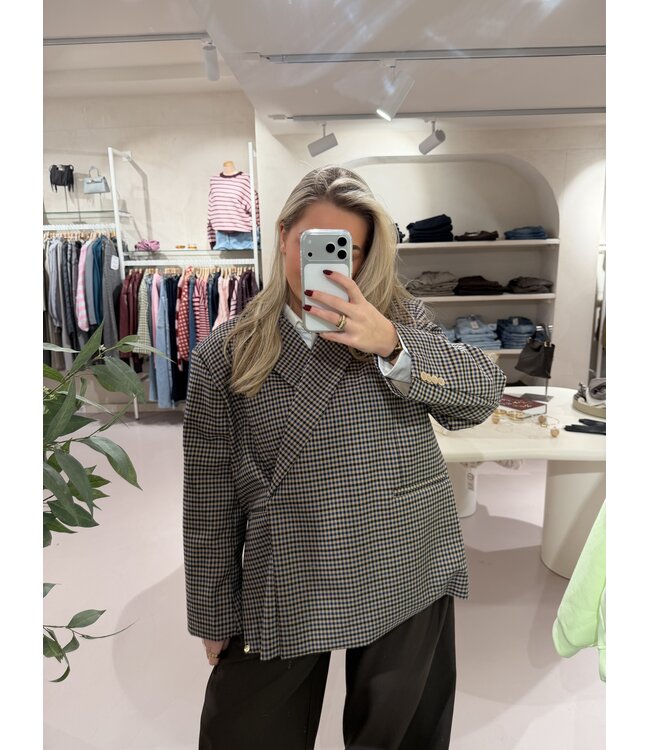 Het Model is 1,68 m, draagt one size en heeft normaal maat S/M. De blazer valt zeer oversized!