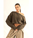 Het model is 1,78 m, draagt one size en heeft normaal maat S/M. De trui bevat 52% Acrylic, 33% recycled polyester en 15% wool.